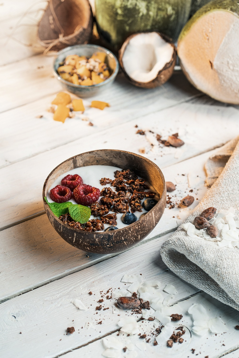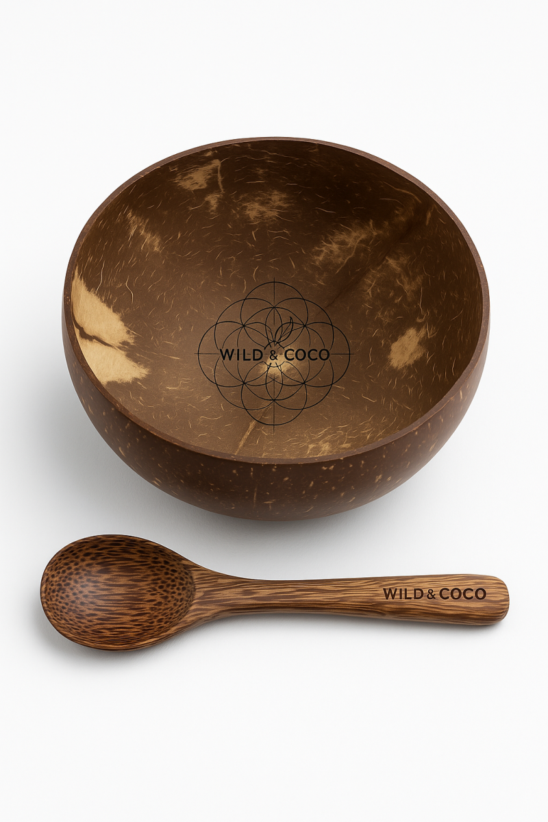 Snídejte jako my – s těmito nádhernými kousky nádobí. Na dno kokosové misky jsme vygravírovali posvátnou geometrii, aby potěšila oko a – pokud je to jen trochu možné – pozvedla vibrace vašeho jídla.
