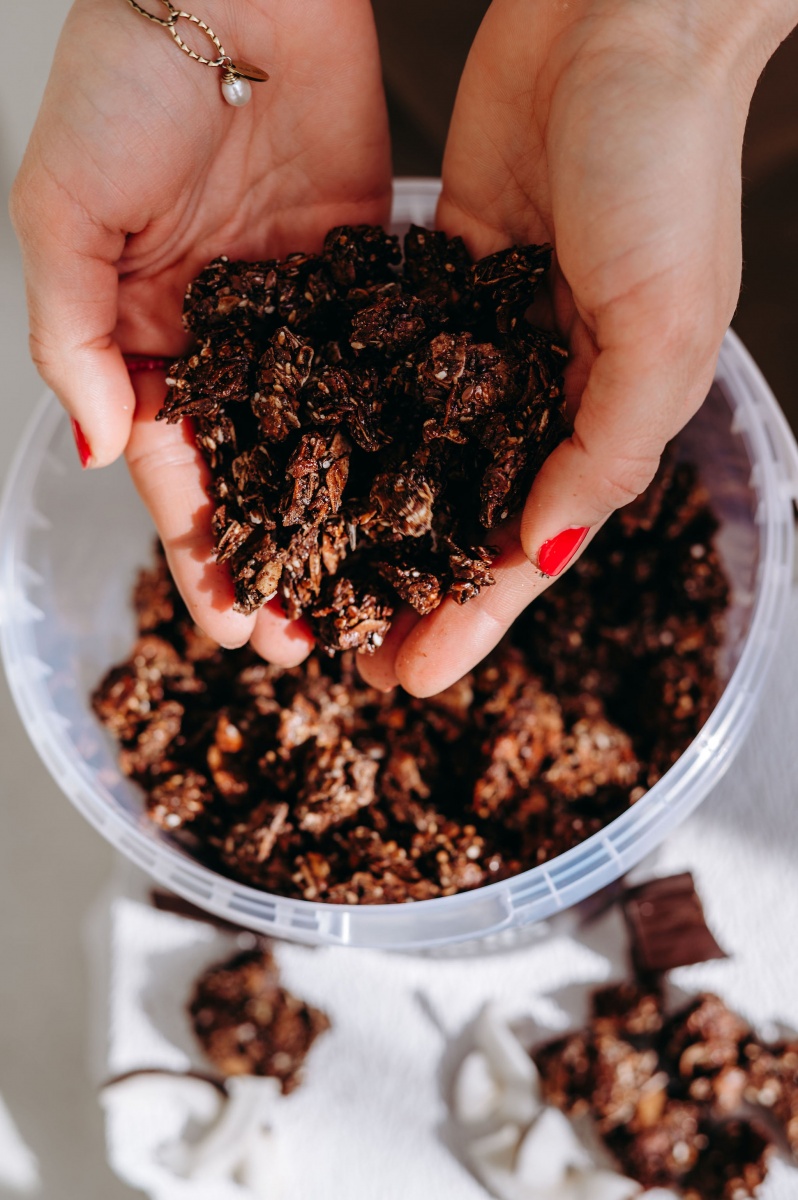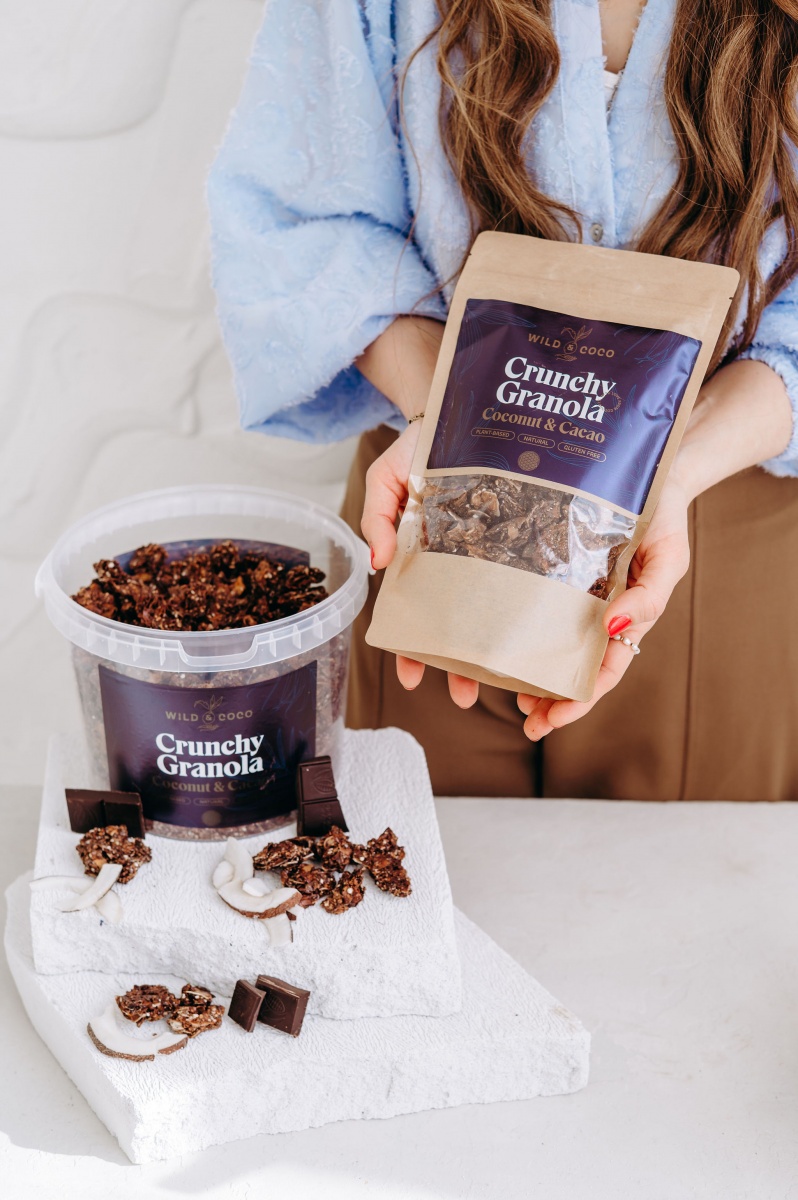 Naše křupavá kakaová granola si našla místo v nejedné snídaňové, svačinové a „mám na něco chuť“ situaci. Díky větším kusům nahradí cereální tyčinku i sušenky k čaji a složením potěší každého bezlepkáře.