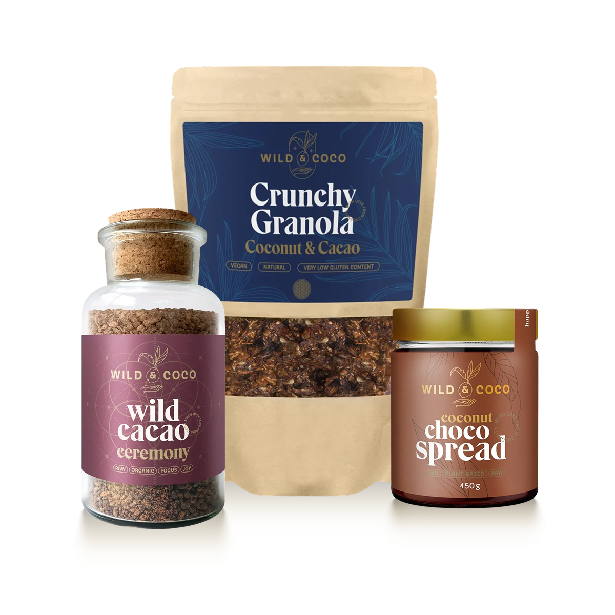 Uvnitř najdete: ceremoniální kakao 190g, kakaovou granolu 250 g a kakaový spread 150 g. Pro chvíle, kdy chcete něco sladkého a zároveň důstojného: ke snídani, odpolední pauze i večernímu zklidnění.