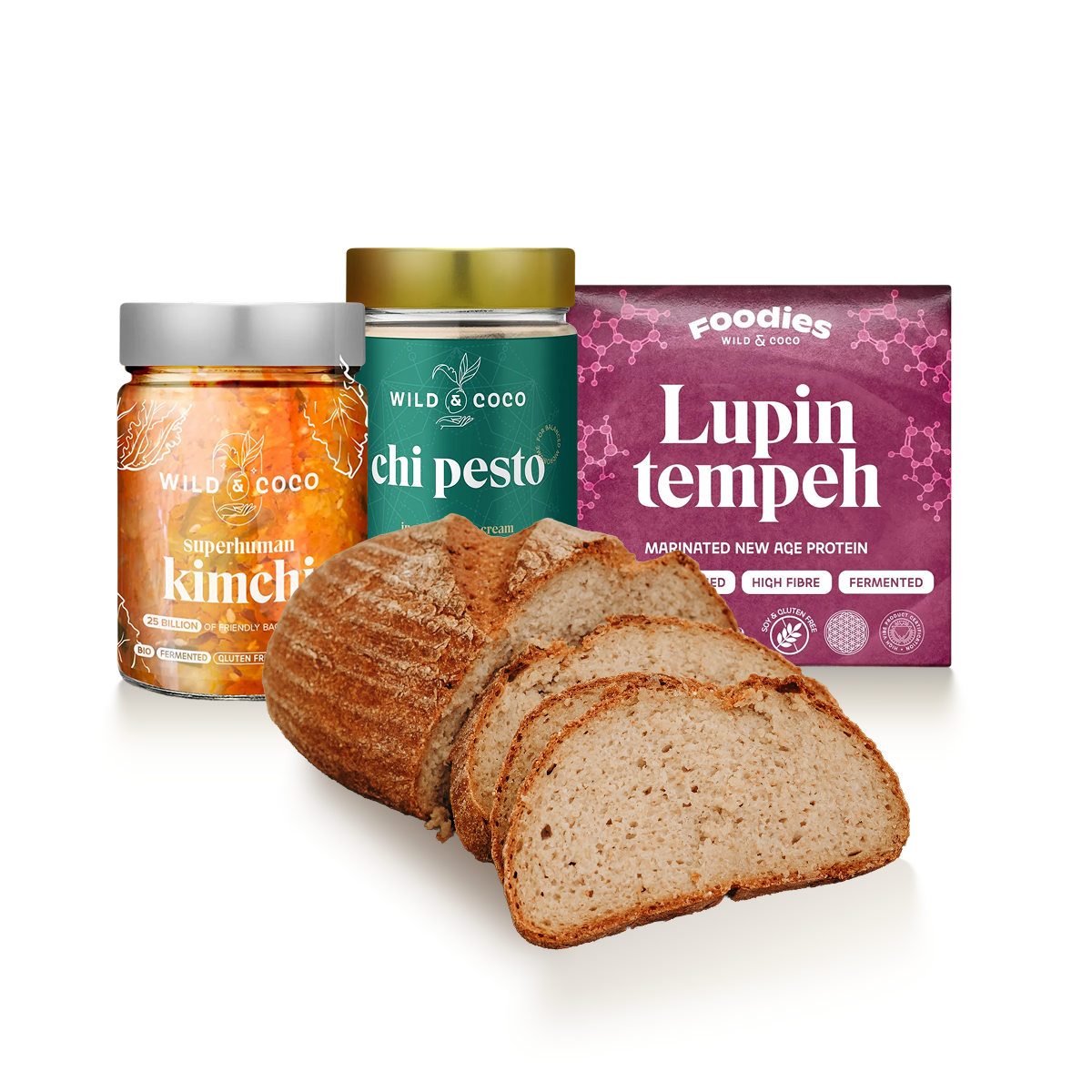 Uvnitř najdete: proteinový chléb, chi pesto, kimchi a lupinový tempeh. Ideální do práce, na cesty i jako lehčí alternativa oběda, když chcete být sytí a zároveň se necítit těžce.