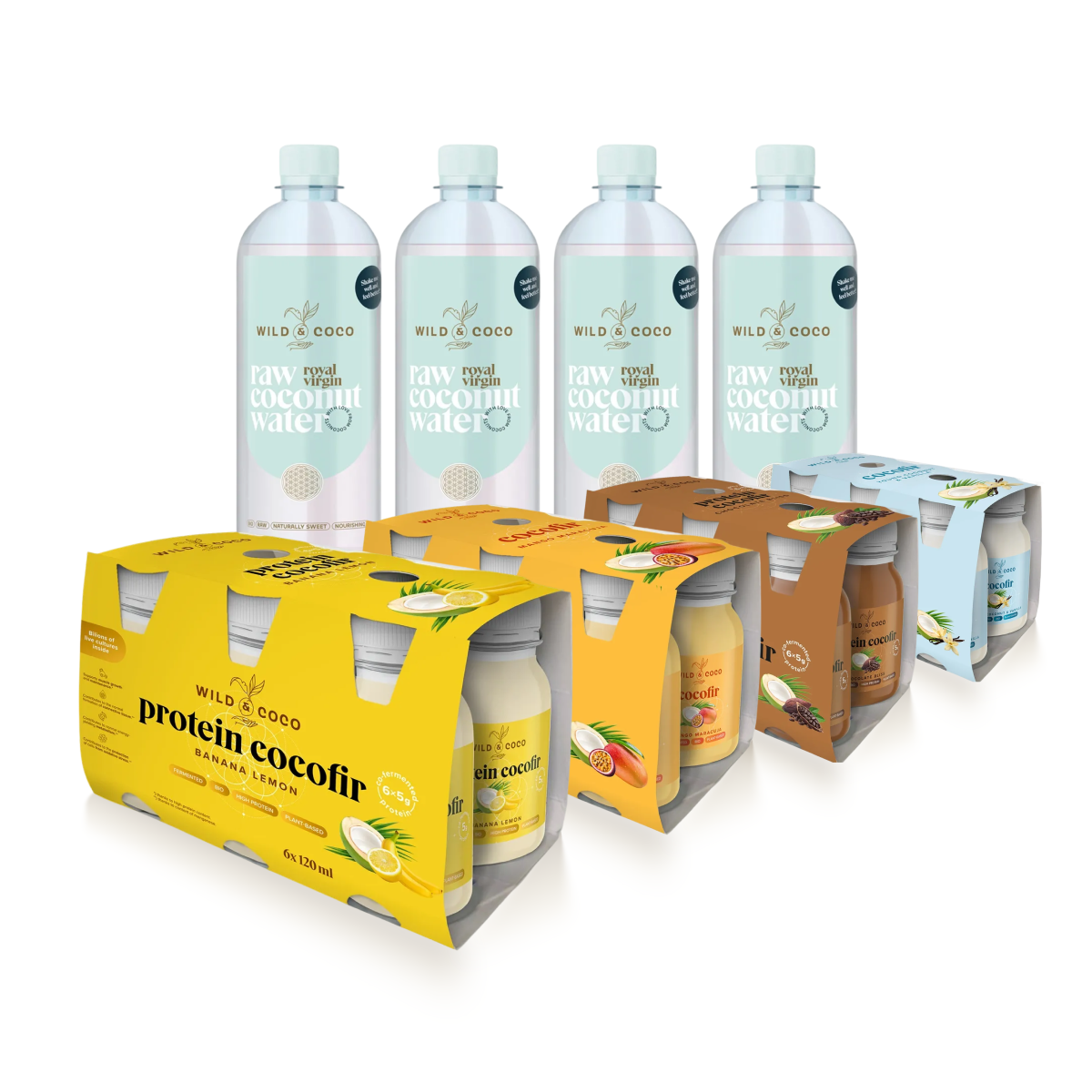 Im Paket findes du: 4× Royal Virgin Kokoswasser und 4 Packungen Shots: 6 Stk. Banana Lemon, 6 Stk. Mango Maracuja, 6 Stk. Schoko Protein, 6 Stk. Young Coconut Vanilla. Für die Arbeit, Reisen, die Schule und Tage, an denen du stabile Energie ohne komplizierte Vorbereitung brauchst.