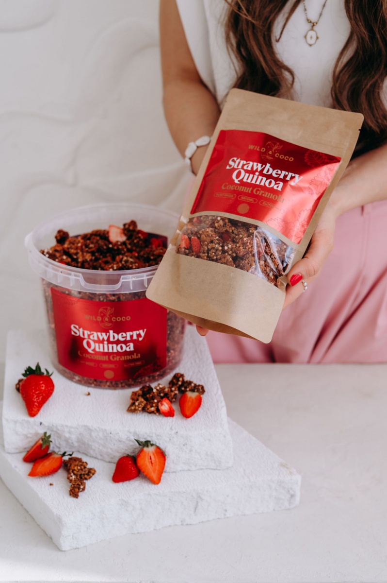 Chrumkavá granola s lyofilizovanými jahodami je bezlepková vegánska pochúťka pre všetkých, ktorí radi raňajkujú, či maškrtia zdravo. Je totiž plná semienok, pufovanej quinoy a samozrejme kokosových chipsov. Agáve sirup a pomleté ľanové semienka držia všetko pohromade, takže si ju pokojne môžete vziať so sebou na výlet, či do práce a pojedať len tak. Výborne sa tiež hodí na raňajky s cocoguardom.